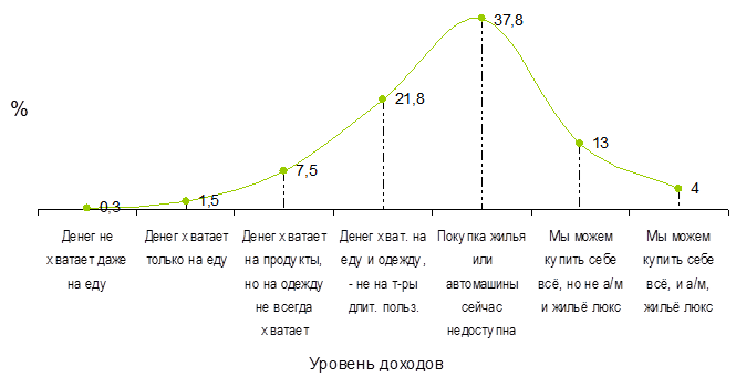 Распределение по материальному положению опрошенных выглядит следующим образом: наибольшее количество респондентов (37,8%) отметили свое материальное положение как «Денег хватает на покупку товаров длительного пользования, однако покупка жилья или автомашины сейчас недоступна», - см. рис. 3 5 .
